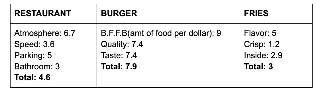 Through Jonah's ratings, we see that their specialty is really just their burger, which, as mentioned, is insane. Here’s what Jonah thought: